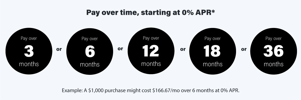 For example, a $750 purchase might cost $250 per month over 3 months at 0% APR. See footer for details.